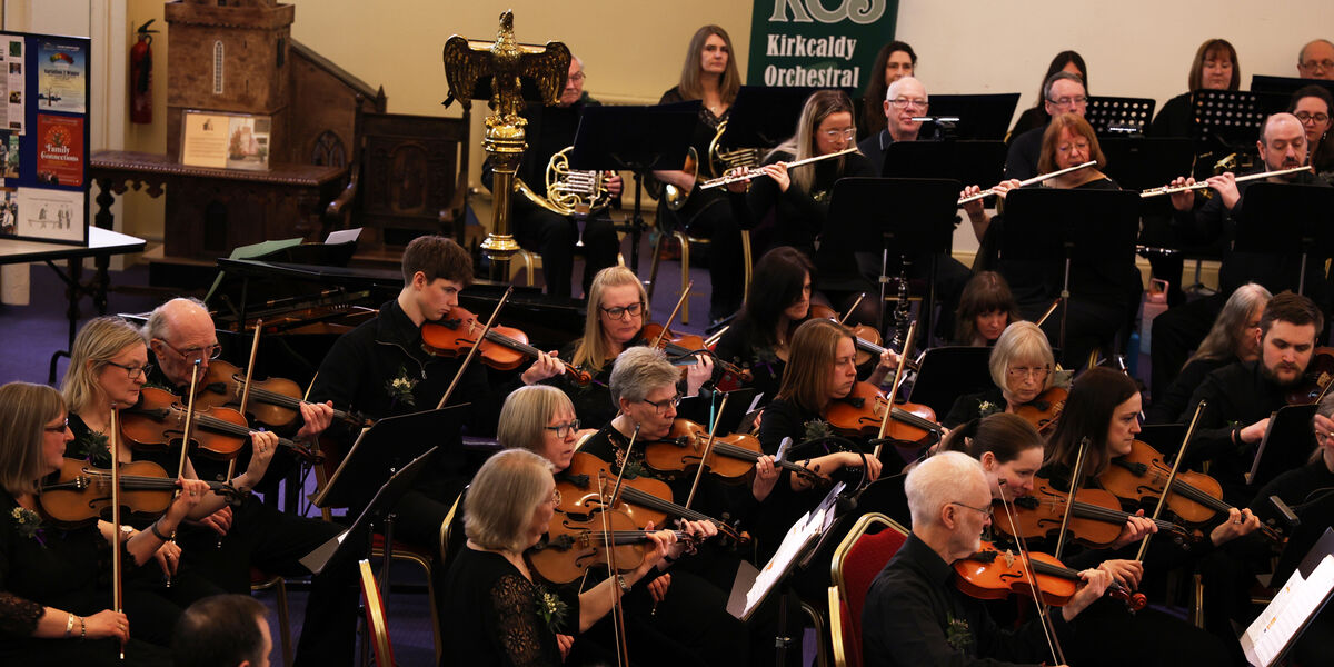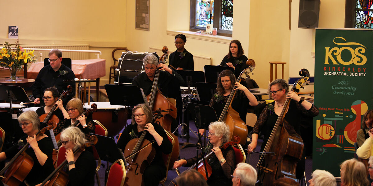 Celebrating its 150th anniversary in 2025, Kirkcaldy Orchestral Society (KOS) has been inspiring musicians and making music in Fife since 1875. The 70-strong community orchestra is a beacon for musicians of all stages and ages playing alongside each other, conducted by Music Director Graeme Wilson, in his 49th season. Players talk of KOS as their ‘happy place’, with members coming from as far as Glasgow and Perthshire. It’s a non-auditioned orchestra, with subsidised memberships for school-age players and those on reduced incomes. KOS players come with a range of experience and all aspire to excellence. As an integral part of the community, KOS supports local charities during the festive season, collaborates with other local music groups, and performs each year in the Fife Festival of Music.
