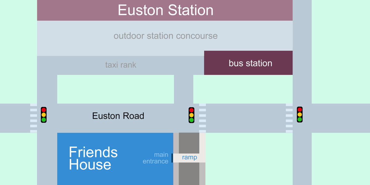 Friends House is directly opposite Euston Station on Euston Road. A wide step-free ramp at the east side of the building leads to the main entrance: